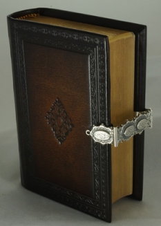 Antiekgebonden micro zakbijbel met blindstempel in lederen band met zilveren slot.