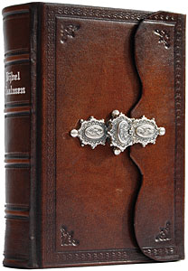 Microbijbel gebonden in antiekleer, met overslaande flap en zilveren magneetslot.
