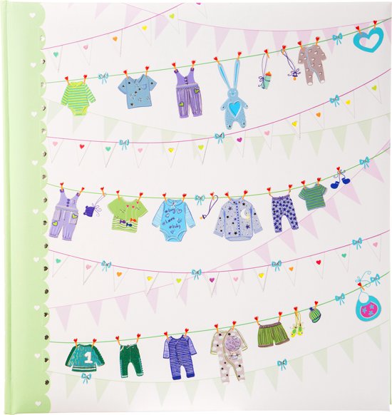 Kleurrijk Turnowsky design babyfotoalbum als fotoboek met een gelamineerde vrolijk geïllustreerde omslag met allemaal waslijntjes met babykleertjes in goud- en reliëfdruk. Als je met je hand over de kaft strijkt voel je het reliëf duidelijk. Dit fotoalbum heeft tussenpagina's met pergamijn, zodat Uw waardevolle foto's optimaal beschermt zijn. Het album heeft witte bladen. Dit is een album ontworpen door design merk TURNOWSKY. In dit fotoalbum zitten 4 geïllustreerde pagina's met Nederlandse tekst om de eerste belevenissen van uw baby te noteren.