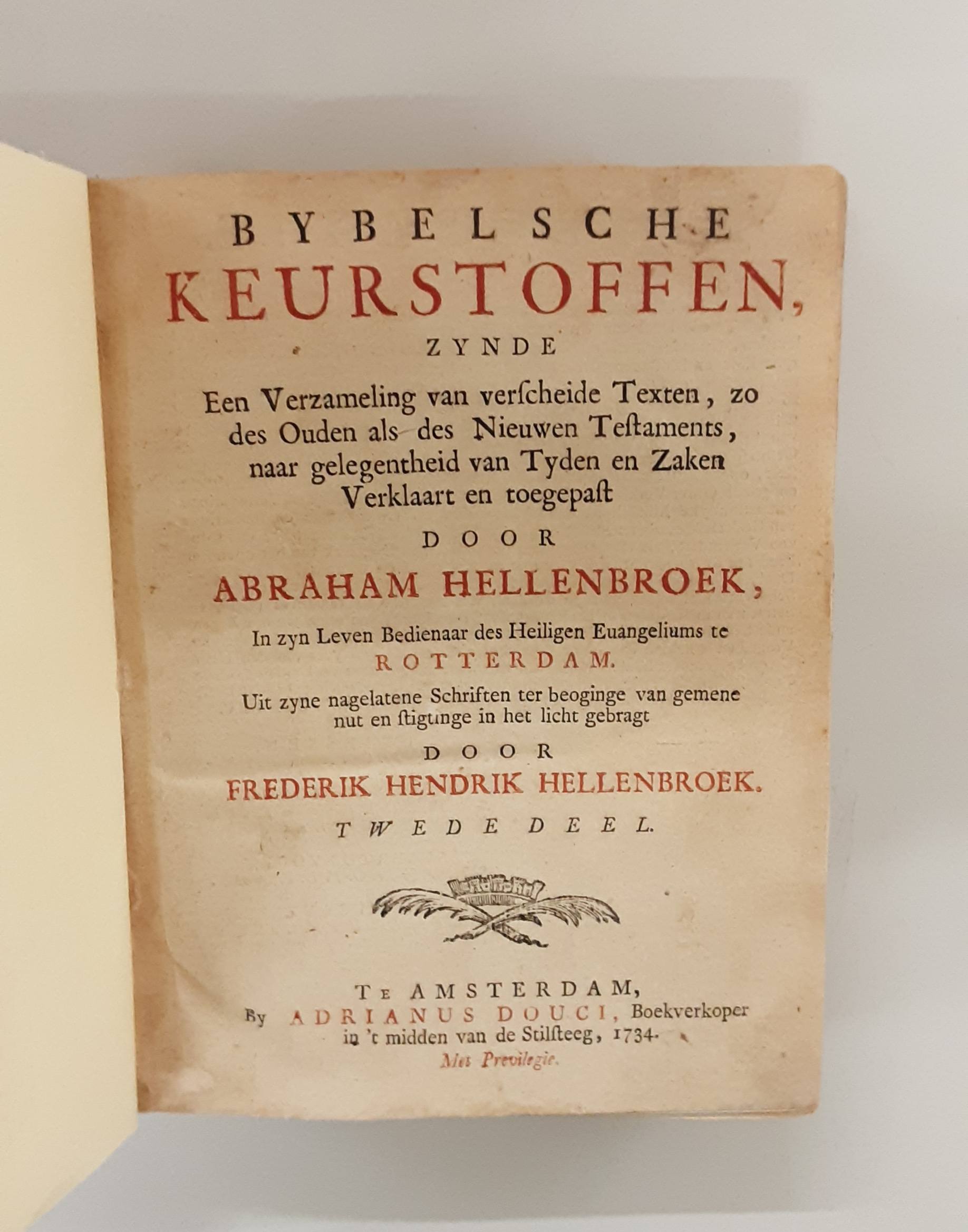 Bybelsche keurstoffen, zynde een verzameling van verscheide Texten, zo des Ouden als des Nieuwen Testaments, Naar gelegenheid van Tyden en Zaken verklaart en toegepast. Uit zyne nagelatene Schriften ter beoging van gemene nut en stigtinge in het licht gebragt door Frederik Hendrik Hellenbroek.