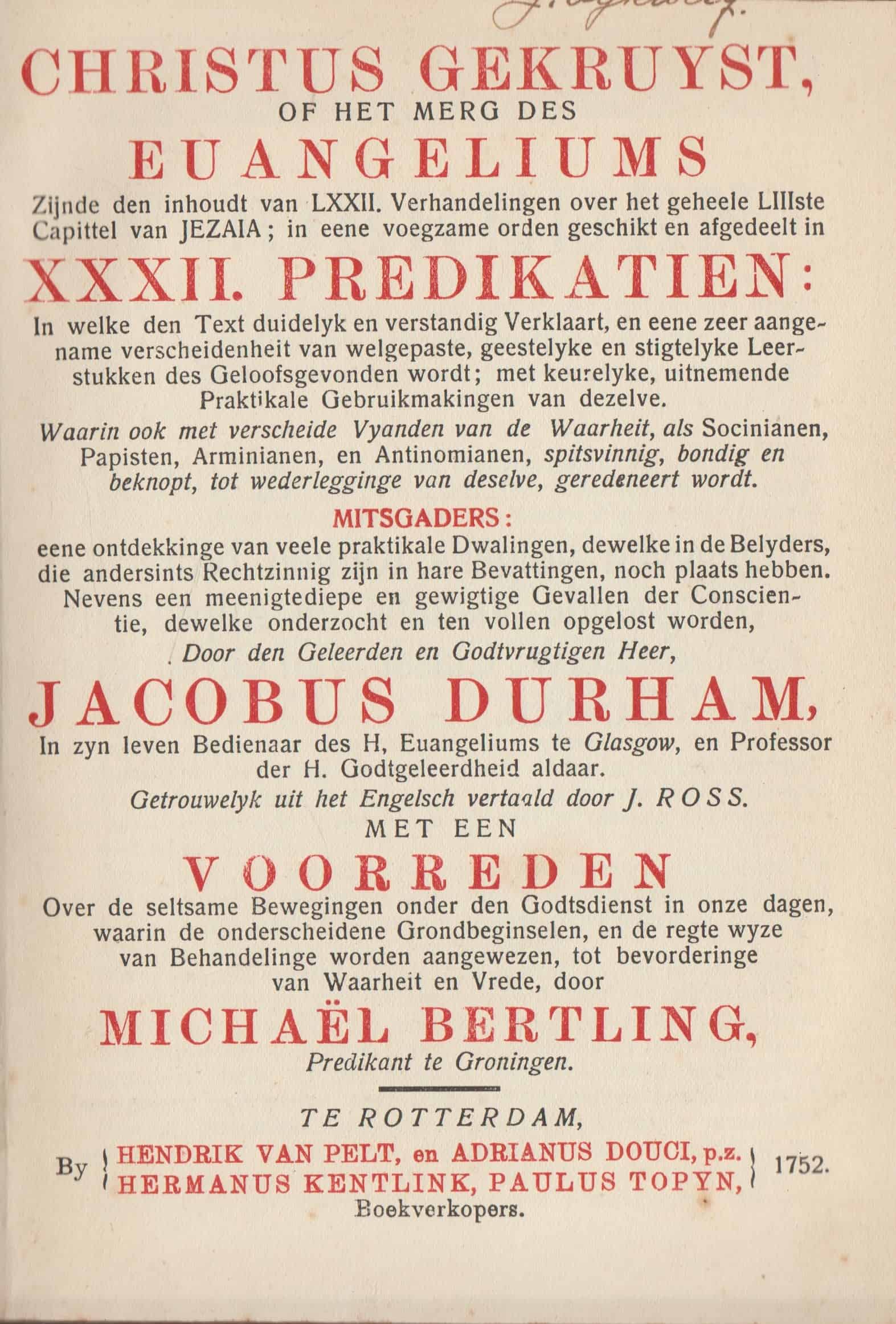 Christus Gekruyst, of het Merg des Evangeliums, Zynde den Inhoudt van LXXII. Verhandelingen over het geheele LIIIste Capittel van Jezaia. In eene voegzame orden geschikt en afgedeelt in XXXII. Predikatien: In welke den Text duidelyk en verstan...