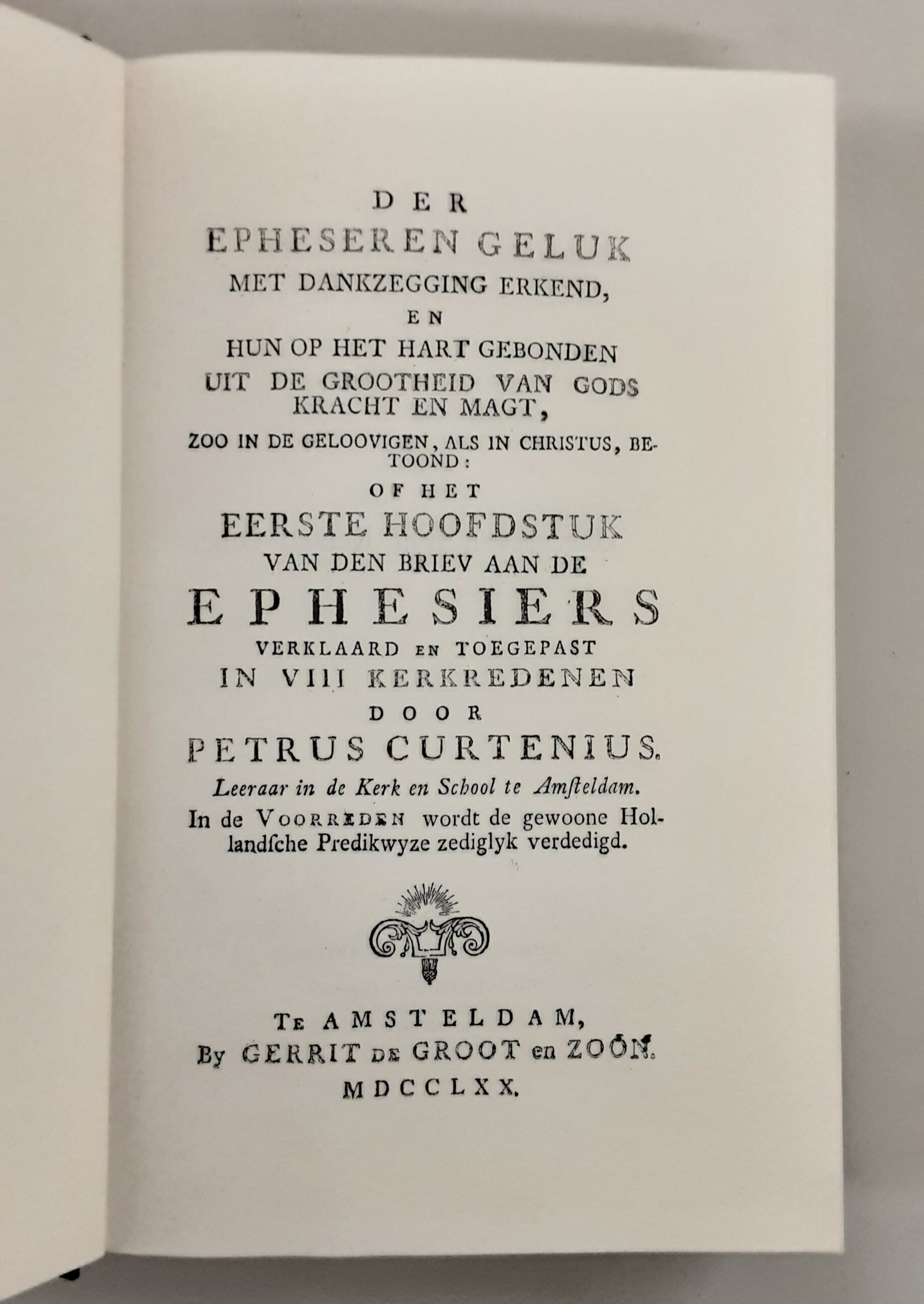Der Epheseren Geluk met dankzegging erkend, en hun op het hart gebonden uit de Grootheid van Gods Kracht en Magt, zoo in de gelovigen, als in Christus, betoond. Of het Eerste Hoofdstuk van den Briev aan de Ephesiers verklaard en toegepast in VIII. Kerkredenen. In de Voorreden wordt de gewoone Hollandsche Predikwyze zediglyk verdedigd.