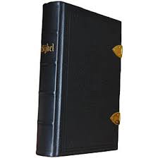 Huisbijbel (18,5x28) in mooie lederen band met blindstempel en 2 koperen sloten. Duidelijke letter