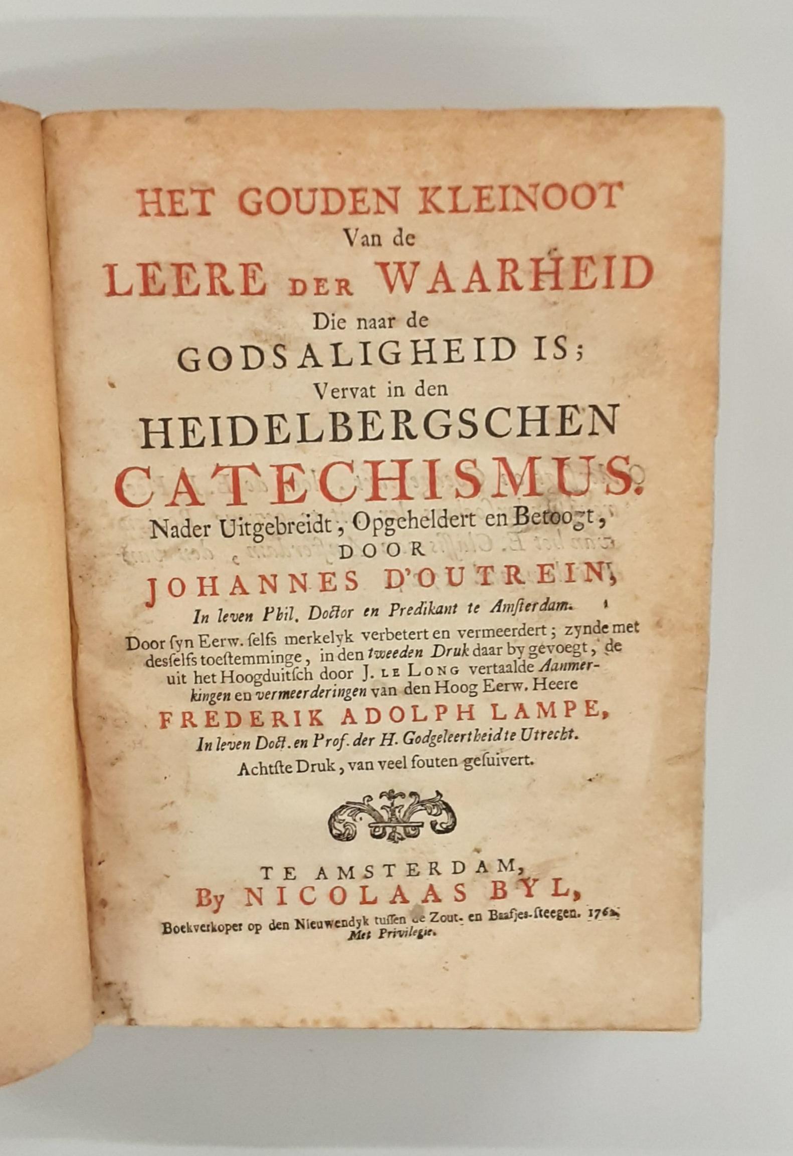 Het Gouden Kleinoot van de Leere der Waarheid die naar de Godsaligheid is. Vervattet in den Heidelbergschen Catechismus. Nader uitgebreidt, Opgeheldert en Betoogt. Door syn Eerw. Selfs merkelyk verbetert en vermeerdert, zynde met desselfs toestemminge, in desen tweeden Druk daar bygevoegt, de uit het Hoogduitsch door Isaac le Long vertaalde aanmerkingen en vermeerderingen van den Hoog Eerw. Heere Frederik Adolph Lampe.