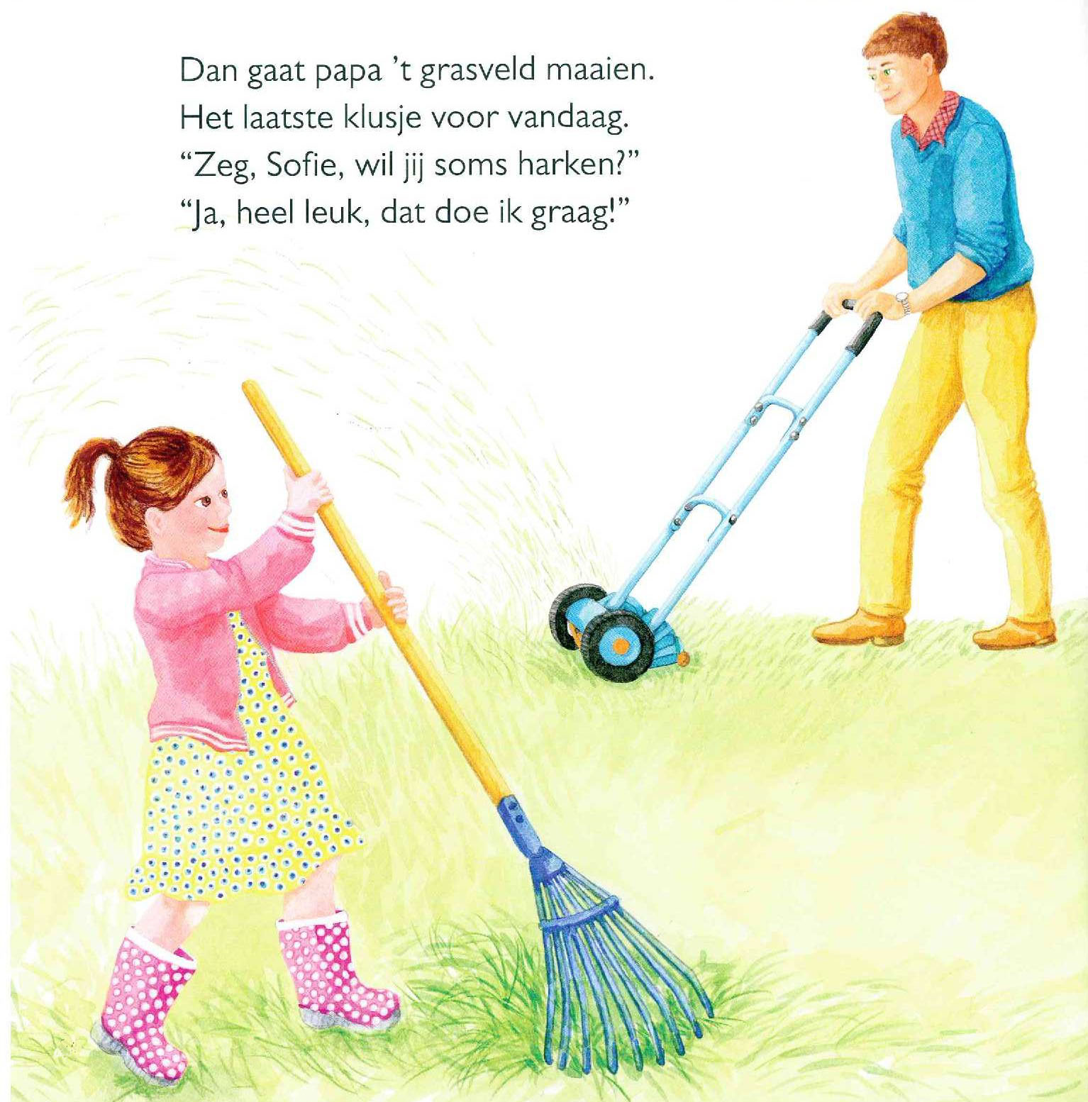 Jasper en Sofie mogen mama helpen in de tuin. Ze geven de plantjes water en planten nieuwe zaadjes, ze harken de tuin en vegen de paadjes schoon. Ze zijn er heel druk mee!