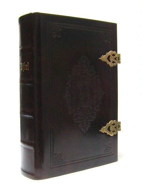 Antiek leder. Kleur bruin gevlamd. Met een ingedrukt stempel en koperen pilaarsloten. Goudsnede. afmeting 146 x 215 mm cm. Met psalmen, formulieren en landkaarten.
