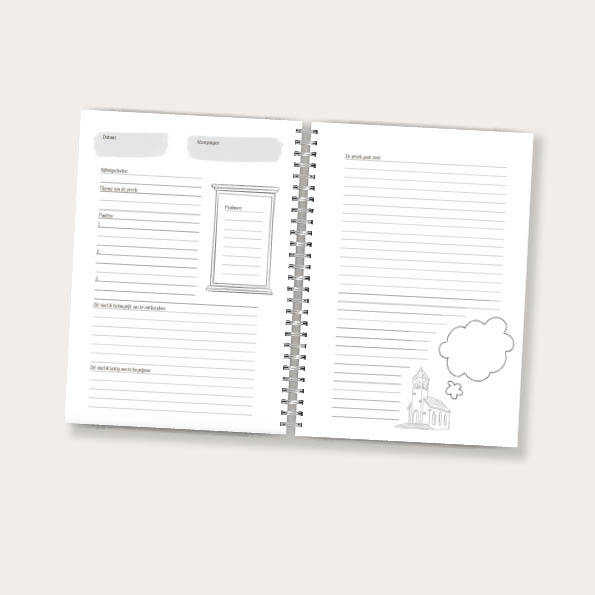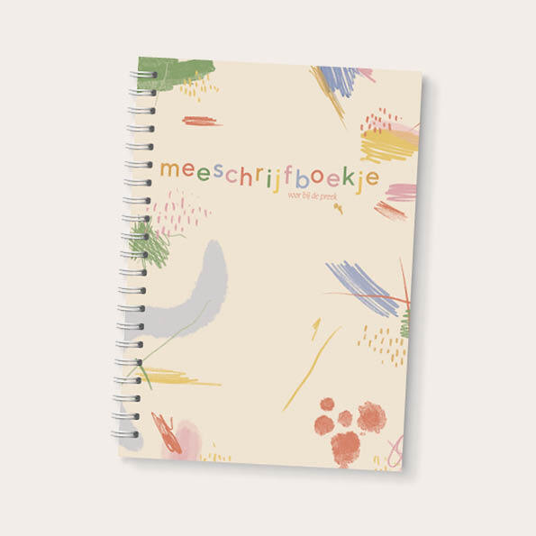 Het meeschrijfboekje is ontworpen om tijdens de preek aantekeningen te maken. Met handige invulvakjes voor het Bijbelgedeelte, het thema van de preek en de punten, zodat ze al een beetje op weg geholpen worden. De ruimte in het meeschrijfboekje is bij elke preek zo gestructureerd, dat kinderen gericht luisteren en nadenken over wat er tijdens de preek gezegd wordt.