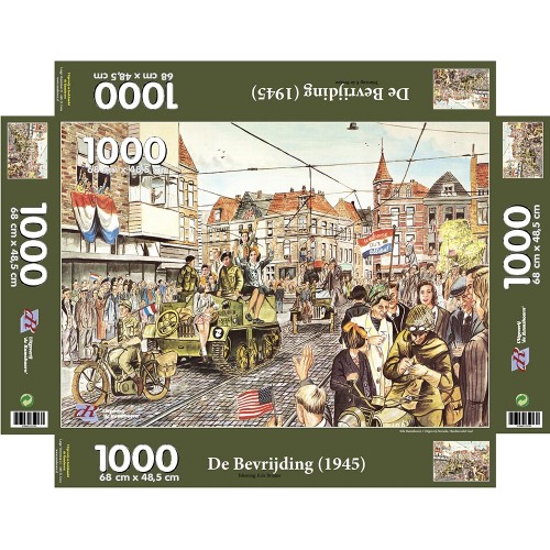 Door de soldaten worden chocola, sigaretten en natuurlijk ook handtekeningen uitgedeeld. Rechtsboven is een vlag zichtbaar met het opschrift ‘Verwelkom onze bondgenoten’, maar dan wel in het Engels. Sommige mensen blijven veilig binnen en hebben vanuit de bovenramen een goed uitzicht op de stoet.