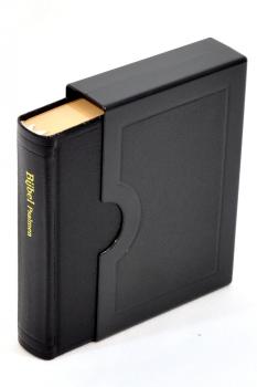 Zakbijbel (klein), met Psalmen en formulieren. 8,5 x 12,5 cm. Dundruk. Met 10 landkaartjes. Kunstleer en kleursnee, met zwarte kunststof koker. Met ritmische muzieknotatie.