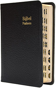 Statenvertaling. Oude en Nieuwe Testament, Psalmen, 13 gezangen, formulieren en10 landkaartjes. Formaat 8,5 x 12,5 cm. Leren zwarte band, goudsnede met duimgreep.